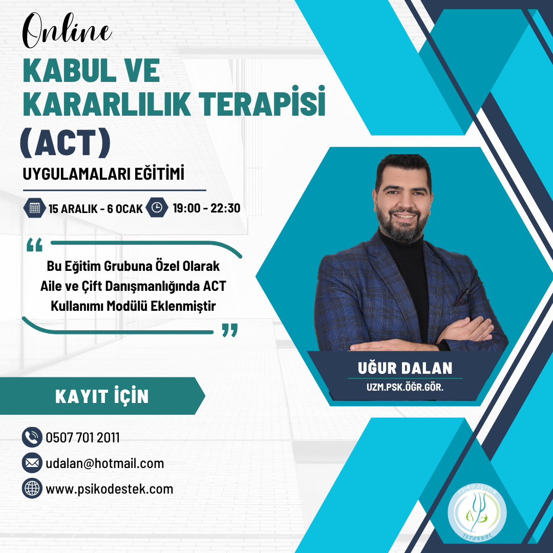 ACT ( Kabul ve Kararlılık Terapisi) Etkililiği ile ilgili 750’den fazla deneysel çalışma bulunan 3.Dalga Bilişsel Davranışçı Terapiler yaklaşımının önemli bir modelidir ve günümüzde terapistlerin çok sık kullandıkları, etkilerini oldukça fazla gördükleri bir modeldir.